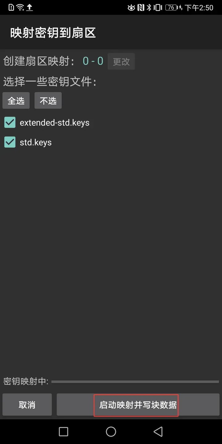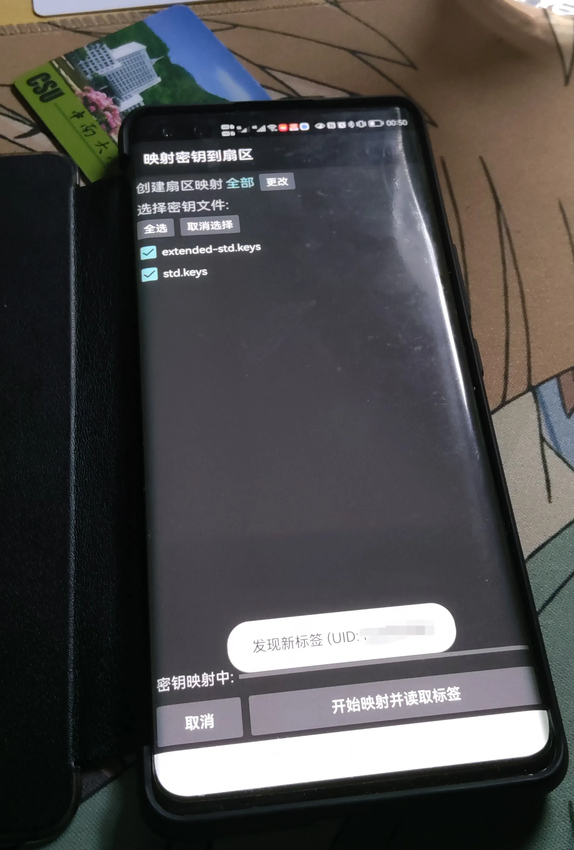选择“读标签”,全选密钥文件,将校园卡放在手机下(手机NFC一般是在摄像头附近),调整好位置,发现屏幕底下显示了卡片的序列号,拿笔记下你的序列号,这个序列号是非常重要的,然后点击“开始映射并读取标签”。