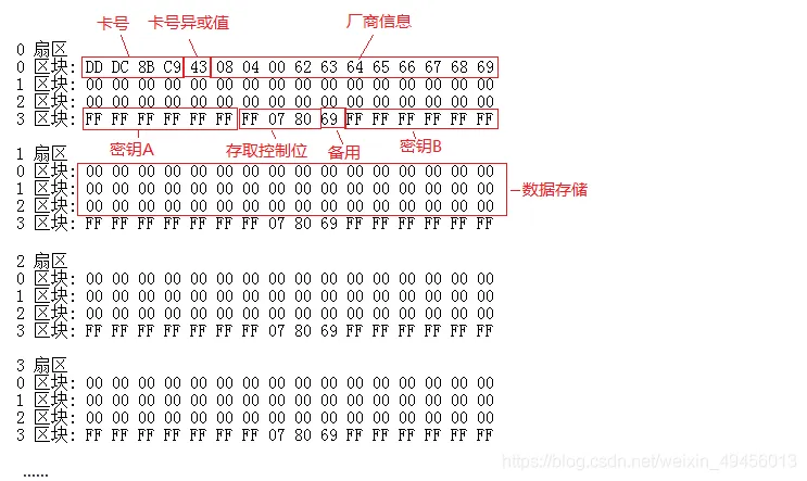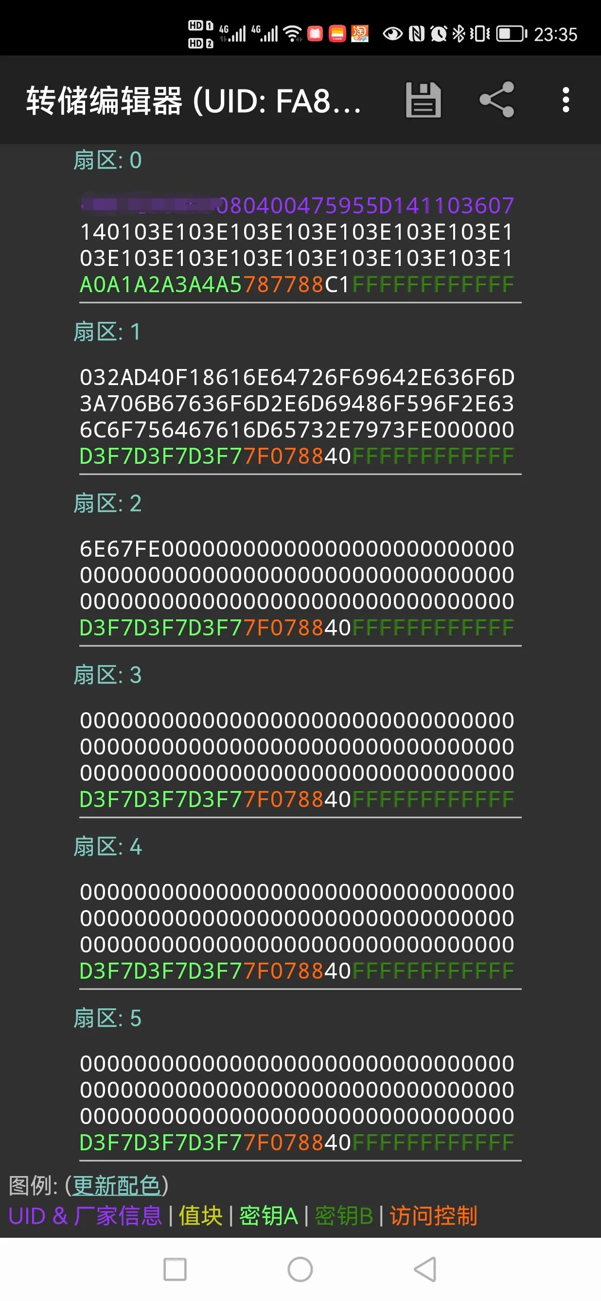 可以观察到,最上面一排紫色的是UID和厂家信息,密钥A和密钥B分别是其下面的绿色的和深绿色的,看扇区0就好。
