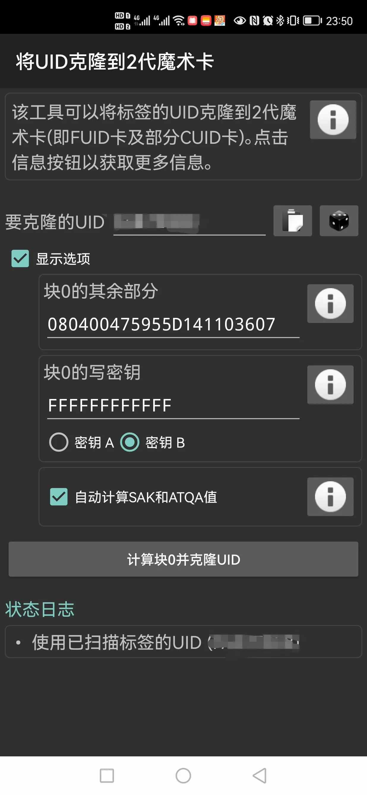 记下密钥,填写到克隆UID那里,把CUID卡放好,然后点击“计算块0并克隆UID”,火速搞定。