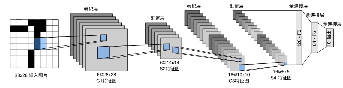 LeNet-5是深度学习之父,Yann LeCun于1998年提出的最早的卷积神经网络,当时是用来解决手写体数字识别问题,其网络结构图如下所示,从LeNet-5开始,CNN就形成了若干个(卷积、池化)层+(用于特定任务的全连接层)的范式
