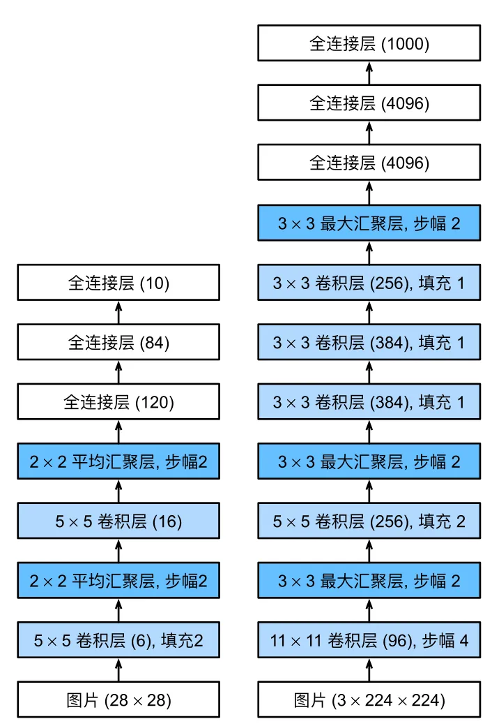 下图为LeNet-5(左)和AlexNet(右)的对比,AlexNet任然保留了N个卷积池化+全连接层的形式。