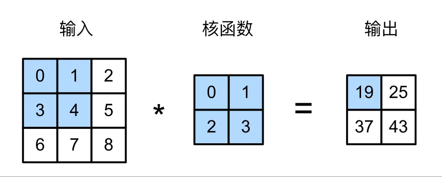 二维互相关运算:0 x 0 + 1 x 1 + 3 x 2 + 4 x 3 = 19