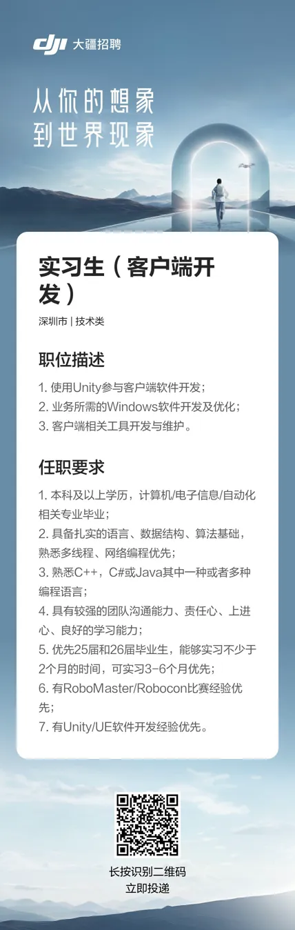 准备找工作的同学,此项目完全对标dji的rm专招通道的客户端开发岗位,并且提供转正机会,机不可失。