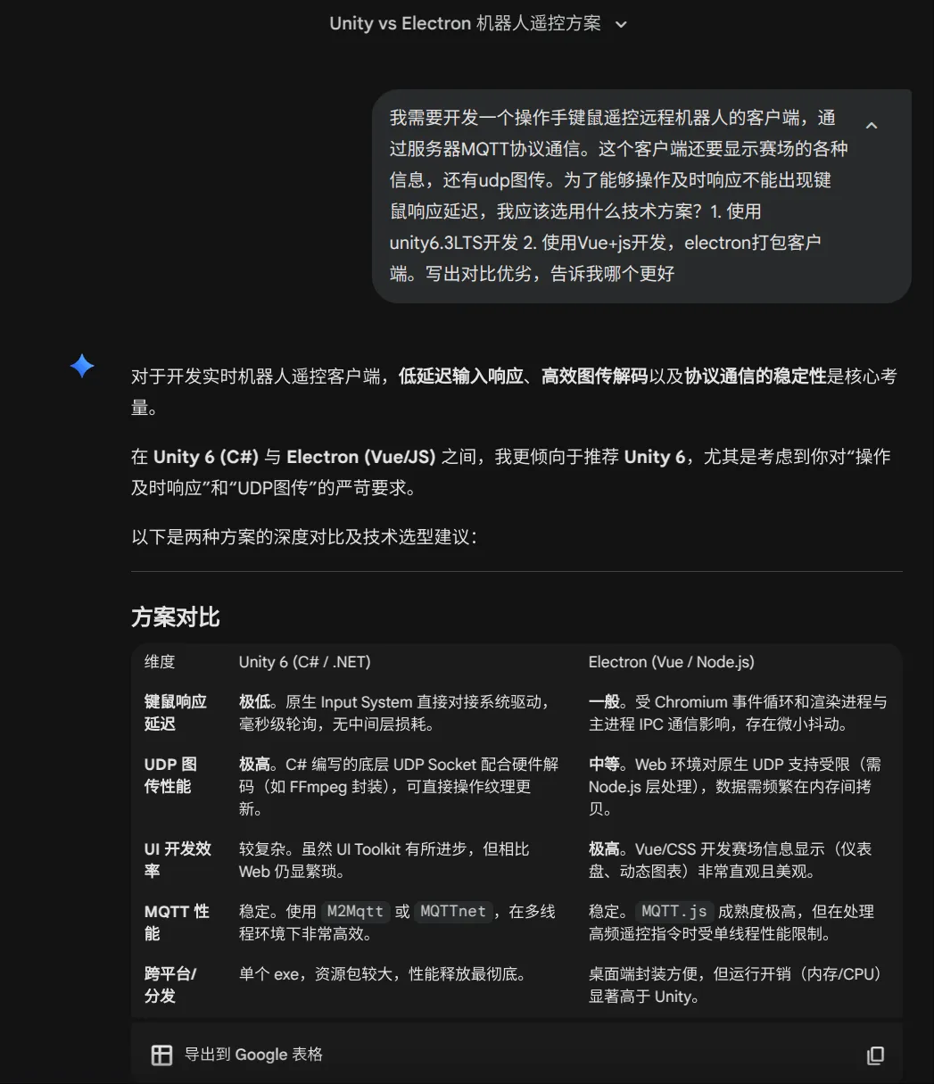 我询问了很多AI,都给出了选择Unity的答案。这里我采用Gemini的回答(之前没有任何提问历史,没有任何上下文,单纯就是这个问题)